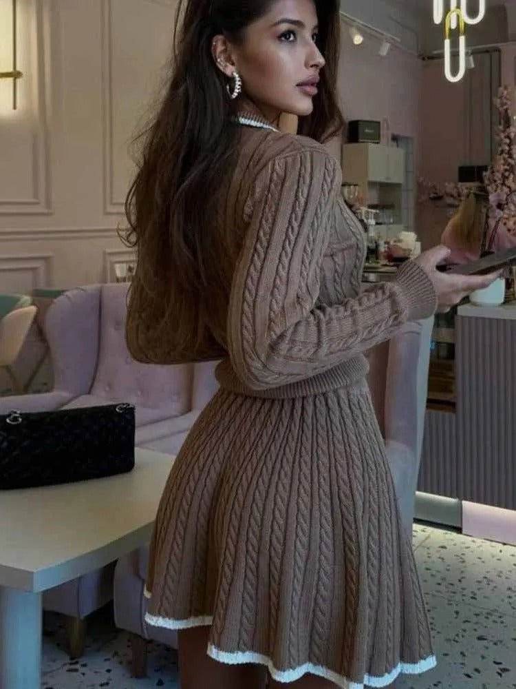 Alba set in maglia è composto da due pezzi: top a maniche lunghe con colletto e bottoni decorativi, e gonna a vita alta coordinata.